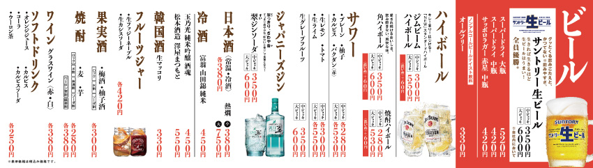 | 営業時間 | 平 日 15:00〜22:30 土日祝 13:00〜22:30 ※ラストオーダー22:00 |